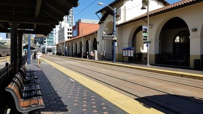 This is the last stop for Coaster commuter trains between Oceanside and San Diego. Ticket machines are available. Purchase ticket before boarding. Riders using PRONTO need to tap card or scan app at a PRONTO validator before boarding. Coaster and Amtrak trains use the 4 outer tracks from the depot building.