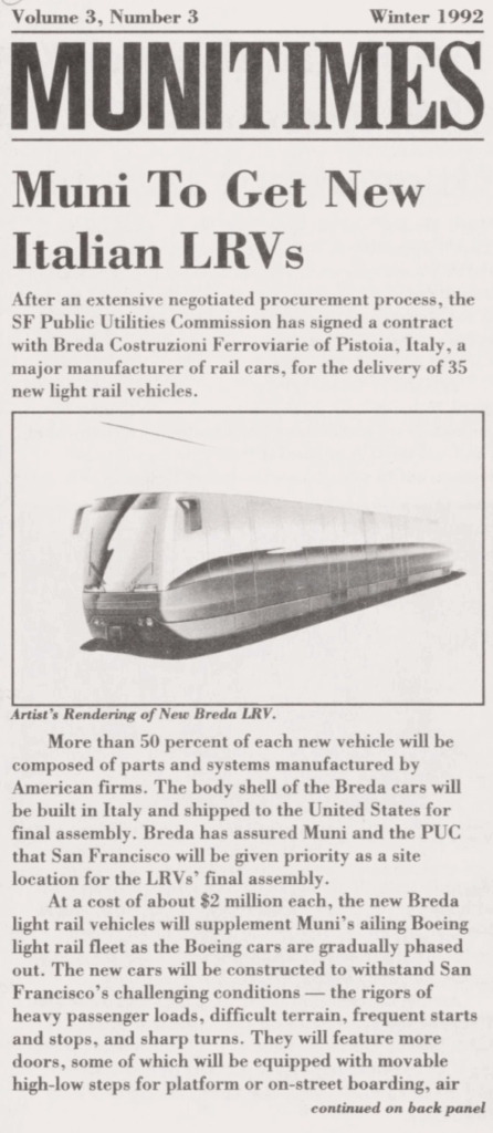 In many ways, Muni Metro struggled to live up to its original vision during its first chapter. In the 1990s, several programs aimed to expand the system and address ongoing issues. These included extending the subway beyond Embarcadero with proper turnback tracks, extending the line beyond the turnback south along the Embarcadero to connect with Caltrain (where the San Francisco Giants eventually built a new ballpark), implementing a new train control system, and introducing new light rail vehicles designed specifically for San Francisco. Breda, an Italian rail car manufacturer, was the sole bidder and was chosen to build the cars in 1991. Prototypes arrived in San Francisco for testing in 1995.