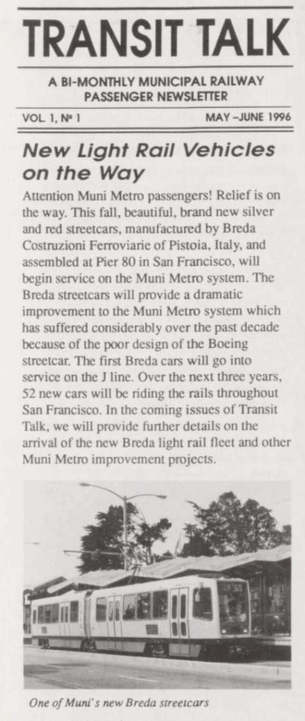 When Breda was introduced, each car cost $2 million, making them the most expensive at the time. The cars were wider and heavier, equipped with more doors and moving steps at each one for level boarding at subway stations. The Breda cars featured a new silver and red livery, while the Boeing LRVs and buses carried the red, orange, and white “Landor” livery. Revenue service began on the J Church line in late 1996.